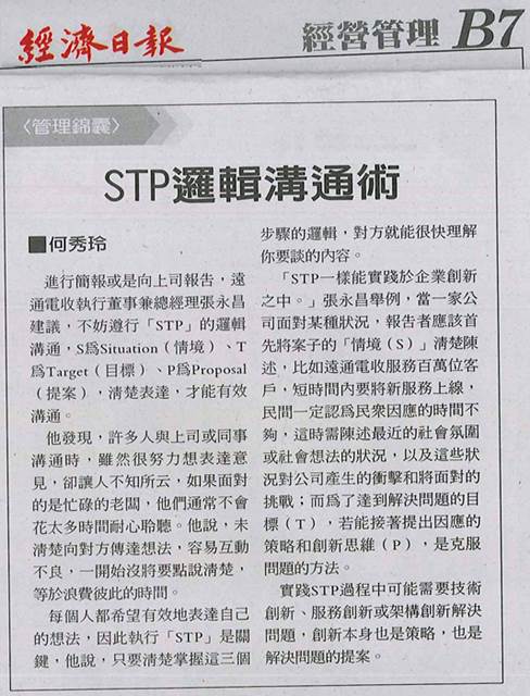 經濟日報第B7版經營管理版面,報導遠通電收執行董事兼總經理張永昌建議之溝通方法─「STP邏輯溝通術」,報導版面如下,和會員朋友分享: